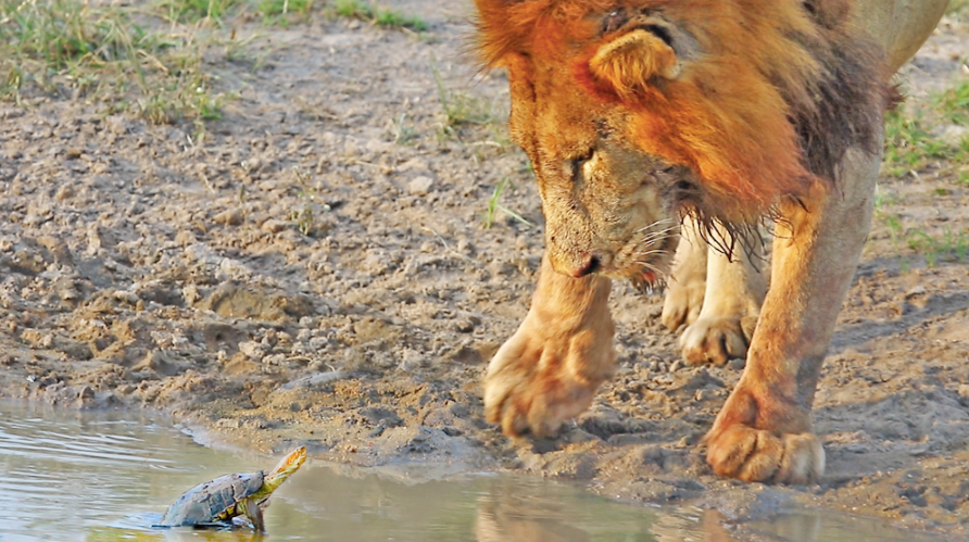 Dieser Löwe lässt sich tatsächlich von einer Schildkröte vertreiben.