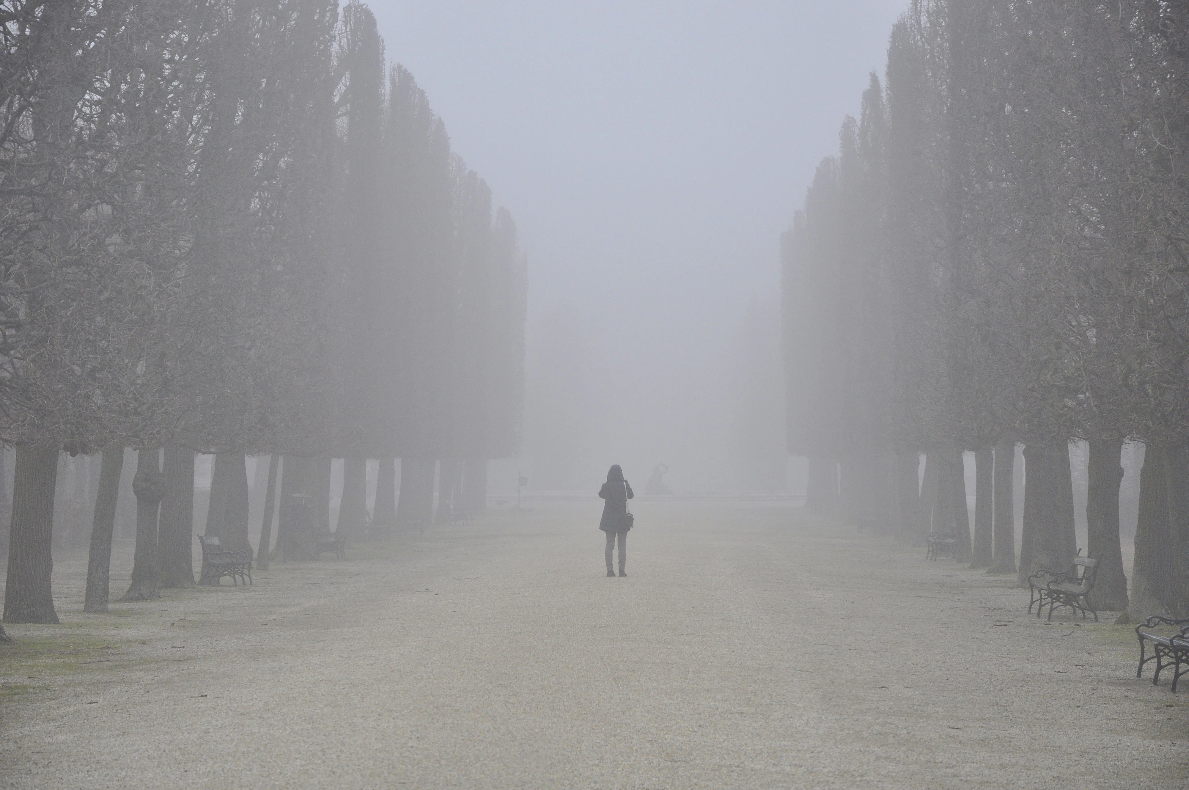 Eine Allee im Schönbrunner Schlosspark versinkt im Nebel.