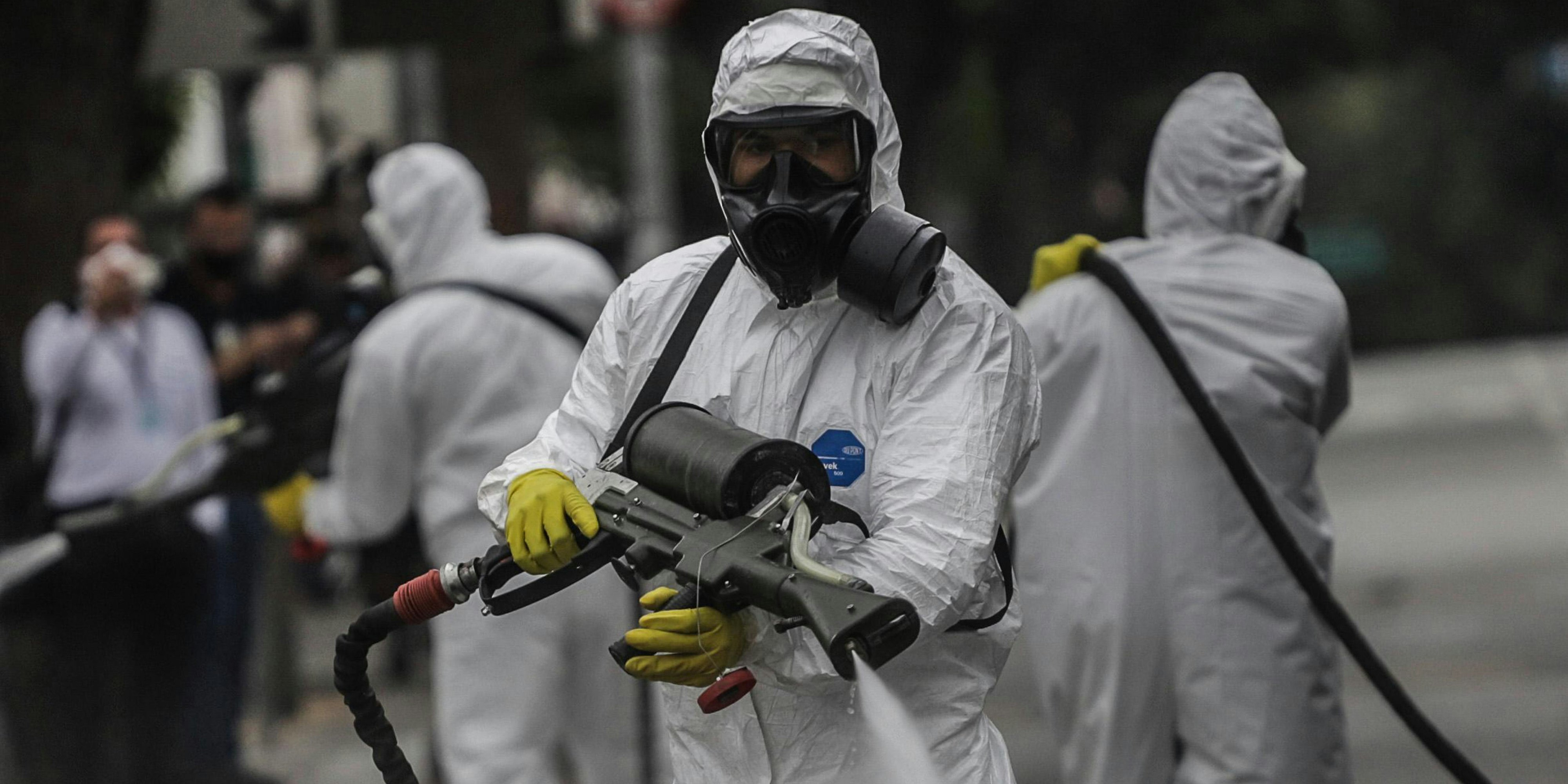 Medizinisches Personal desinfiziert den Congonhas Flughafen in Sao Paulo. An nur einem Tag haben sich in Brasilien 45.000 Menschen mit dem Virus infiziert.