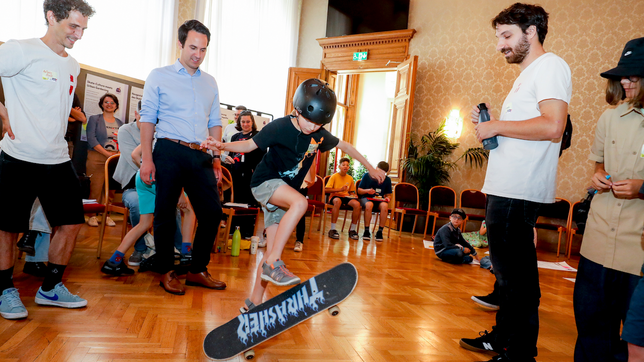 Jugendstadtrat und Vizebürgermeister Christoph Wiederkehr (Neos) traf beim Kinder- und Jugendparlament auf begeisterte Skateboarder.