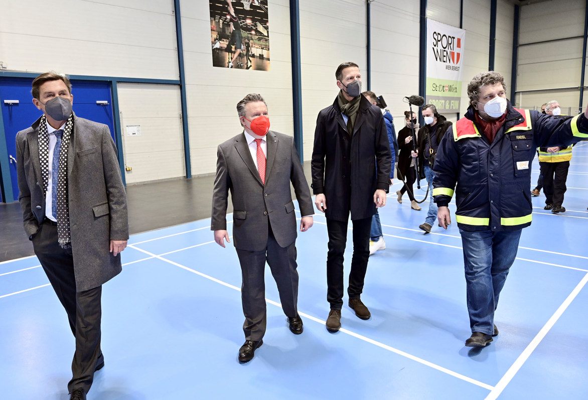 Bürgermeister Michael Ludwig (2.v.li.) und Stadtrat Peter Hanke (li., beide SPÖ) machten sich ein Bild vom Ankunftszentrum in der Leopoldstadt. Der Betrieb soll am Donnerstag starten.