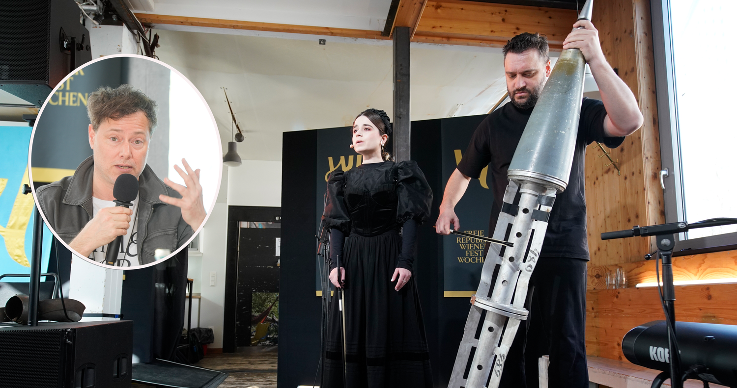 Intendant Milo Rau (l.) präsentiert zum 75. Jubiläum der Wiener Festwochen 35 Produktionen, u.a. "Songs of Winter War" der ukrainischen Künstlerin Marichka Shtyrbulova (M.). Um den Krieg in ihrem Land zu thematisieren, sang sie zum Klang einer Rakete.
