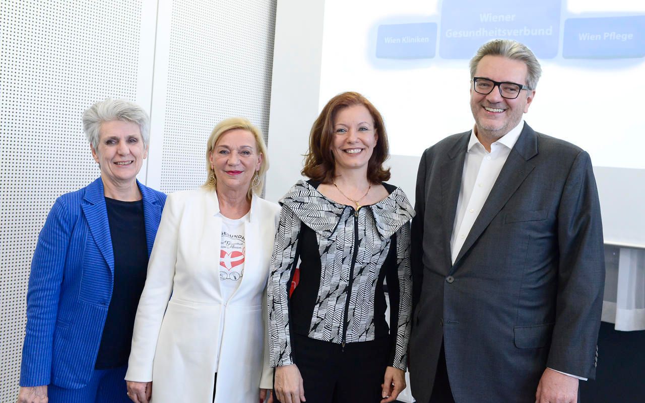 Wiener Krankenanstaltenverbund wird zum Wiener Gesundheitsverbund (v.l.n.r. SP-Gemeinderätin Birgit Meinhard-Schiebel (Grüne), Susanne Jonak von der Gewerkschaft Younion, KAV-Generaldirektorin Evelyn Kölldorfer-Leitgeb und Gesundheitsstadtrat Peter Hacker (SPÖ) (c) PID/alexandra Kromus