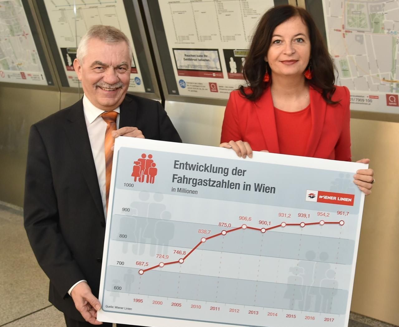 Wiener-Linien-Geschäftsführer Günter Steinbauer und Öffi-Stadträtin Ulli Sima freuen sich über den Fahrgastrekord 2017.