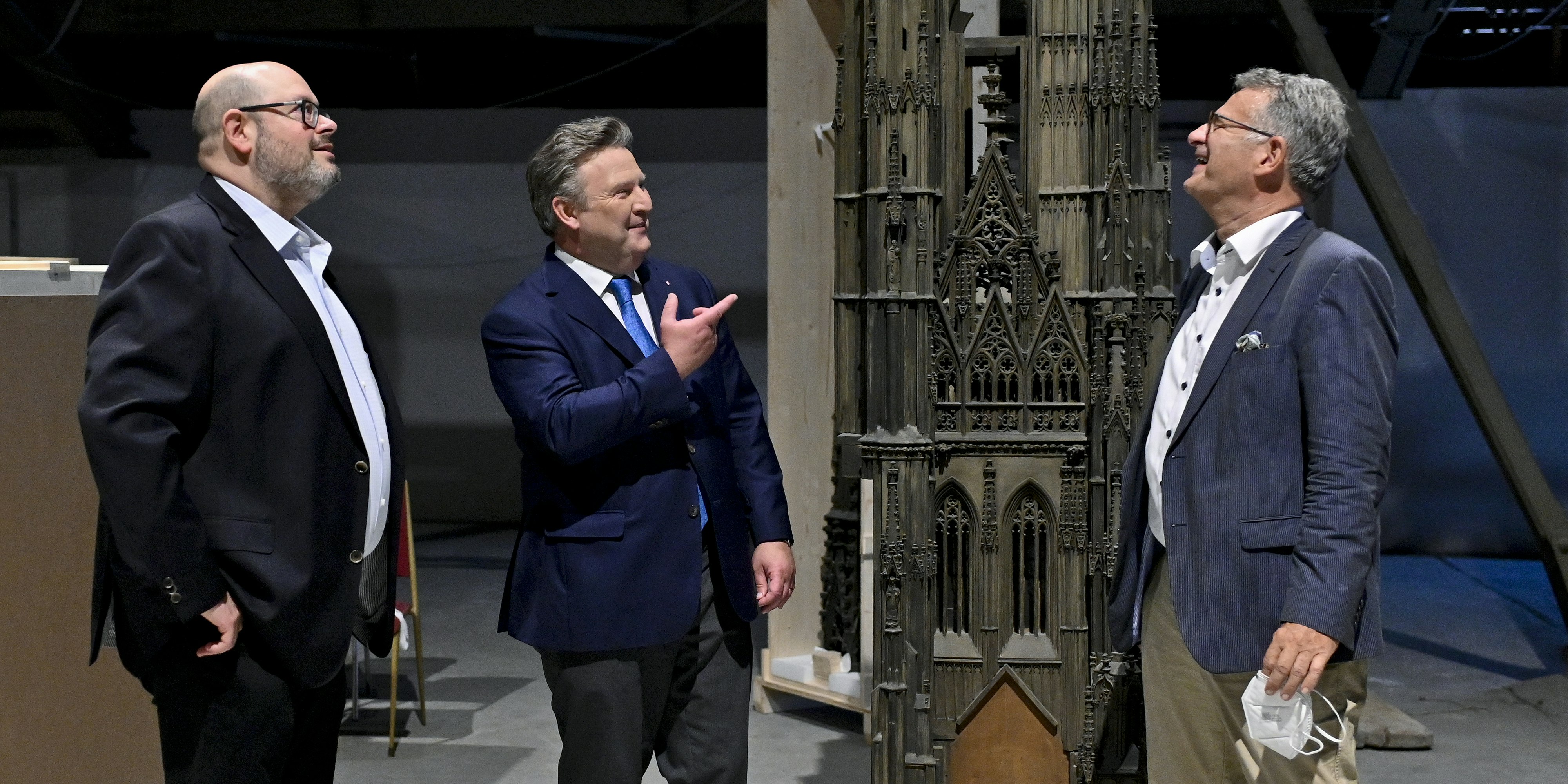 Der Leiter des Wien Museums, Matti Bunzl, mit Bürgermeister Michael Ludwig, Dombaumeister Wolfgang Zehetner und dem Mini-Steffl.