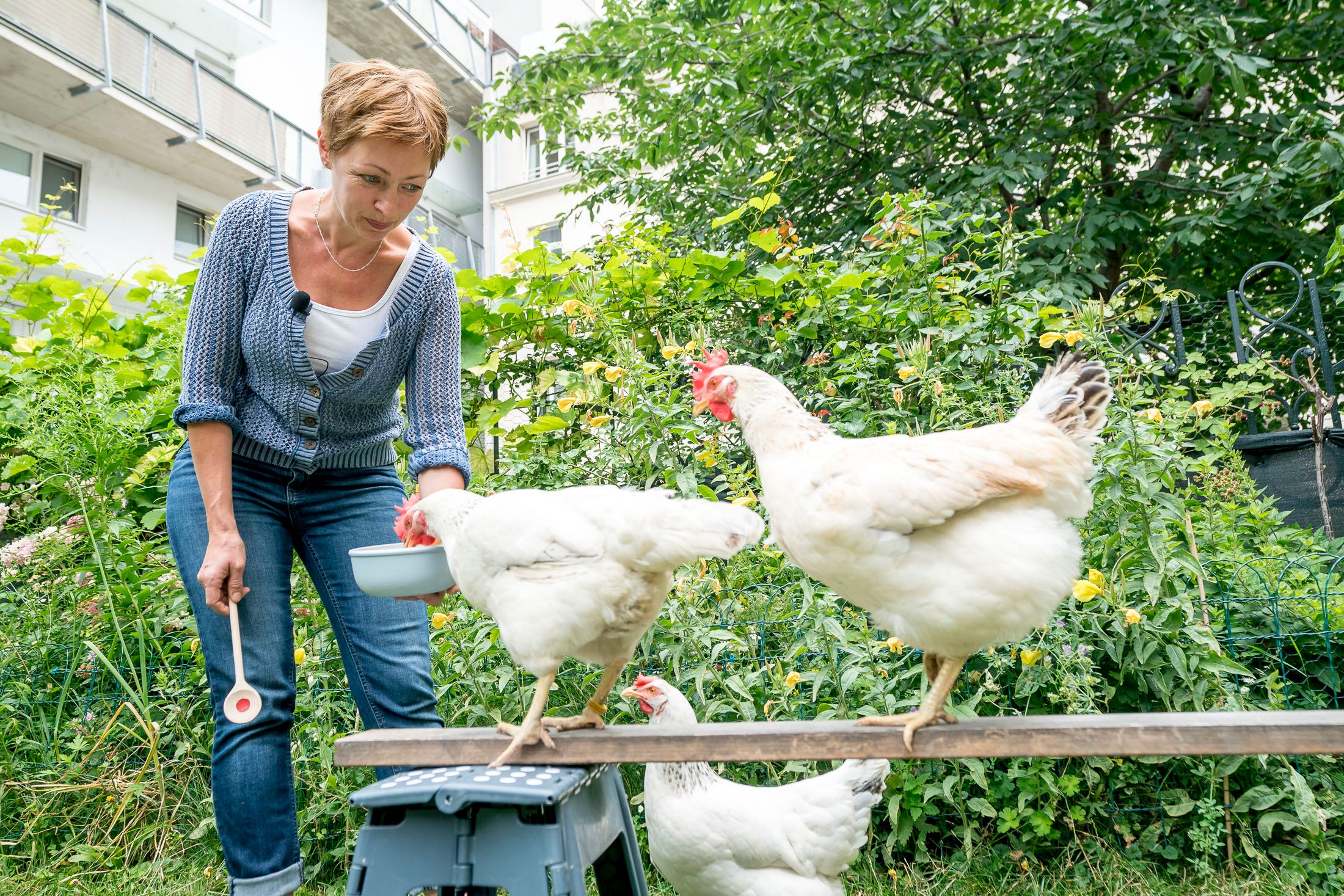 Swantje Hurka bietet mit ihren drei Hühnern Therapiestunden in ihrem Garten an. Das Trio kann mittlerweile auch Kunststücke, wie am Balken balancieren.