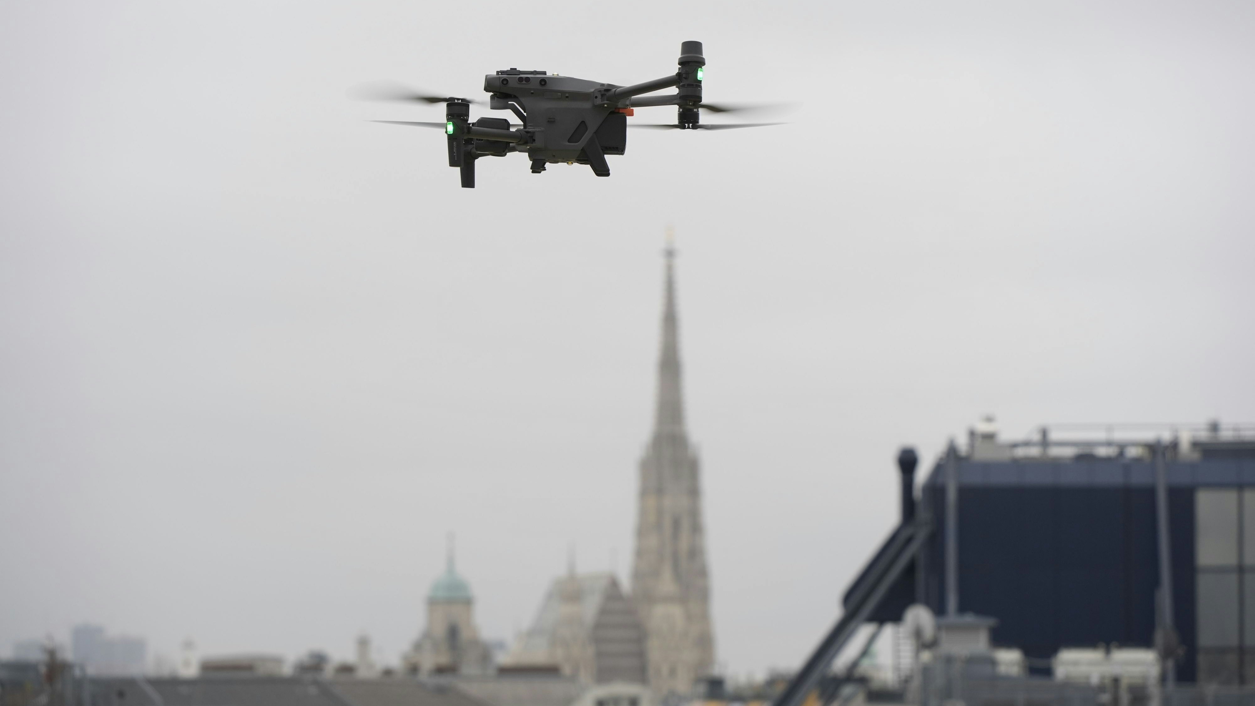 Drohne über den Dächern Wiens mit dem Stephansdom im Hintergrund – ideale Übersicht für Polizeieinsätze.