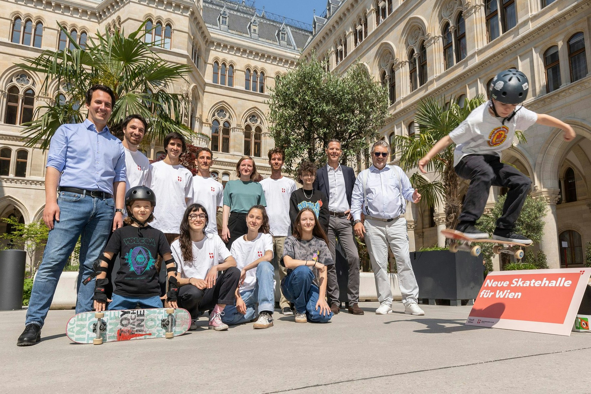 Vizebürgermeister Christoph Wiederkehr (Neos, li.) und Sportstadtrat Peter Hacker (SPÖ, re.) präsentierten gemeinsam mit dem Skateboard Club Vienna das neue Angebot.
