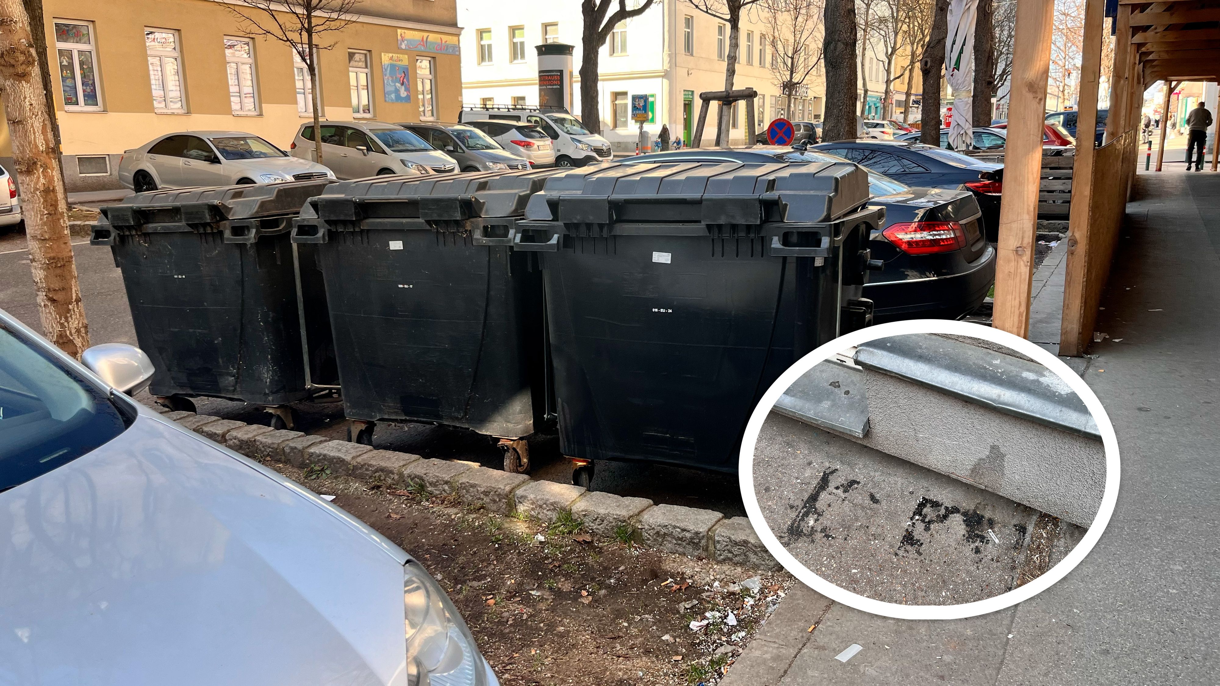 Zwischen den Mistkübeln wurde der Koffer abgestellt. Zuvor wurde ein Mann am Gehsteig samt Koffer gesehen. Die Spuren sind noch deutlich sichtbar.