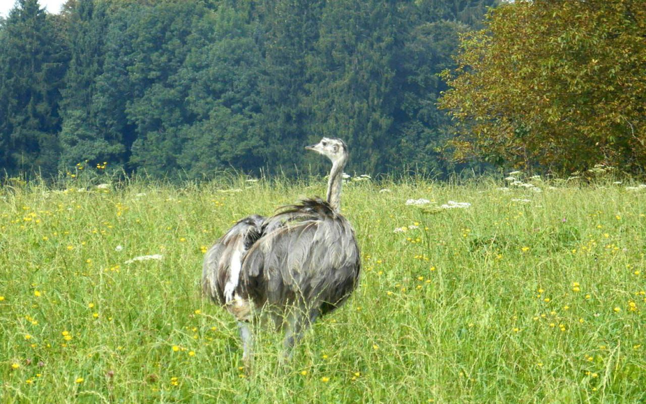 Die Einsatzkräfte jagen den entlaufenen Nandu.