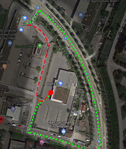 Zur Erinnerung: Auf dem Grund der ehemaligen Floridsdorfer Schicht-Fabrik gibt es zwei Einkaufsbereiche, die entweder von der Donaufelder Straße oder von der Angyalfoldstraße befahren werden konnen. Ein Queren innerhalb des Parkplatzes ist verboten. Autofahrern, die hier dennoch den kurzen Weg von Shop zu Shop nahmen, trudelte eine Unterlassungserklärung ins Haus und wurden mit 239,82 Euro zur Kasse gebeten.