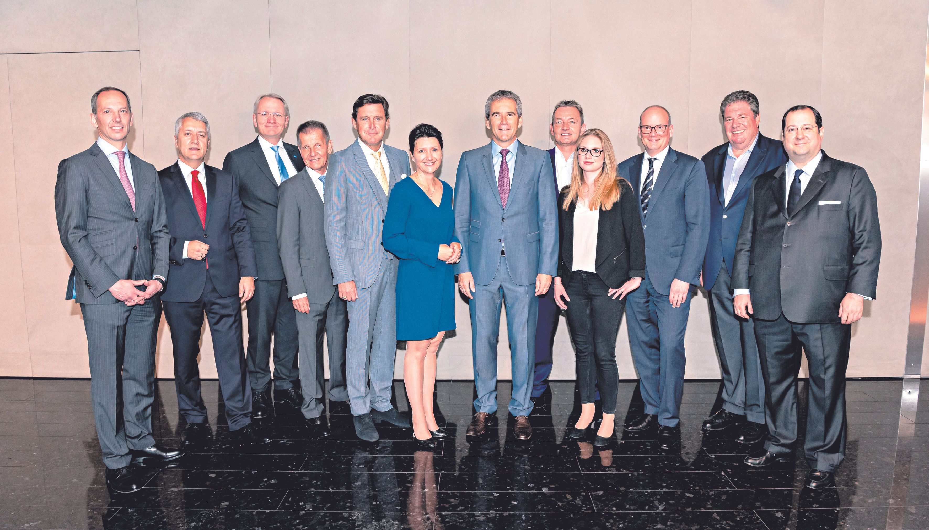 Blicken positiv in die Zukunft (v.l.n.r.): Andreas Fleischmann (Raiffeisenlandesbank NÖ-Wien), Wolfgang Lackner (Europäische Reiseversicherung), Udo Birkner (HYPO NÖ), Erich Forster (Westbahn), Peter Hanke (Wiener Finanzstadtrat), Sandra Bauernfeind (EHL Wohnen), Hartwig Löger (da noch Finanzminister), Marcus Grausam (A1 Telekom Austria), Jacqueline Büchi (Chefredakteurin heute.at), Julian Jäger (Flughafen Wien), Anton Bondi de Antoni (Bondi Immobilien), Daniel Riedl (Vonovia). (Foto: Robert Harson) (ek)