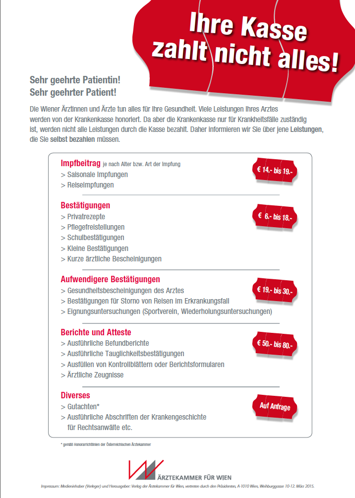 Die Wiener Gebietskrankenkasse klärt mittels Plakat auf, welche Leistungen inkludiert, und welche extra zu berappen sind.
