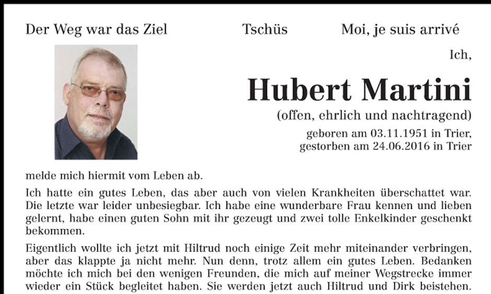 "Offen, ehrlich und nachtragend" - so bezeichnete sich der Deutsche Hubert Martini aus Trier am Beginn seiner selbstverfassten Traueranzeige. Was darunter steht, bestätigt das. Zunächst zieht Martini im Anzeigentext getreu seinem Motto "Der Weg war das Ziel" eine insgesamt Bilanz: "Eigentlich wollte ich jetzt mit Hiltrud noch einige Zeit mehr miteinander verbringen, aber das klappte ja nicht mehr. Nun denn, trotz allem ein gutes Leben."
