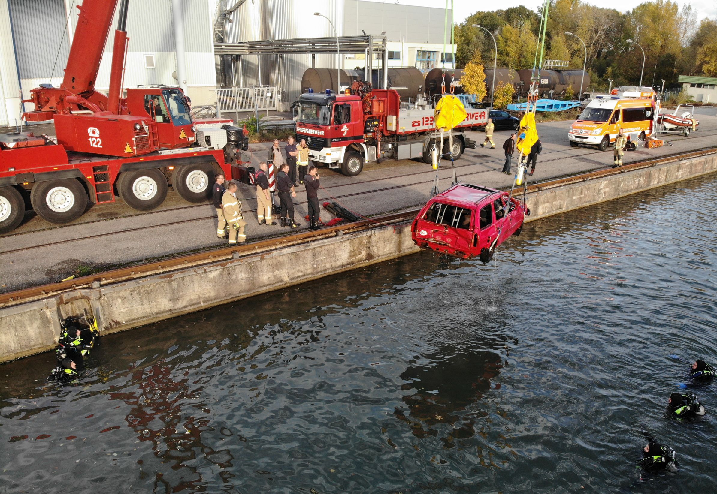 Wir tauchen auch auf. Bleiben an der Wasseroberfläche. Neben dem Hafenbecken steht inzwischen ein Feuerwehrkran. Die Taucher befestigen dessen Haken an Gurten, so wird das Auto nach oben gehoben.