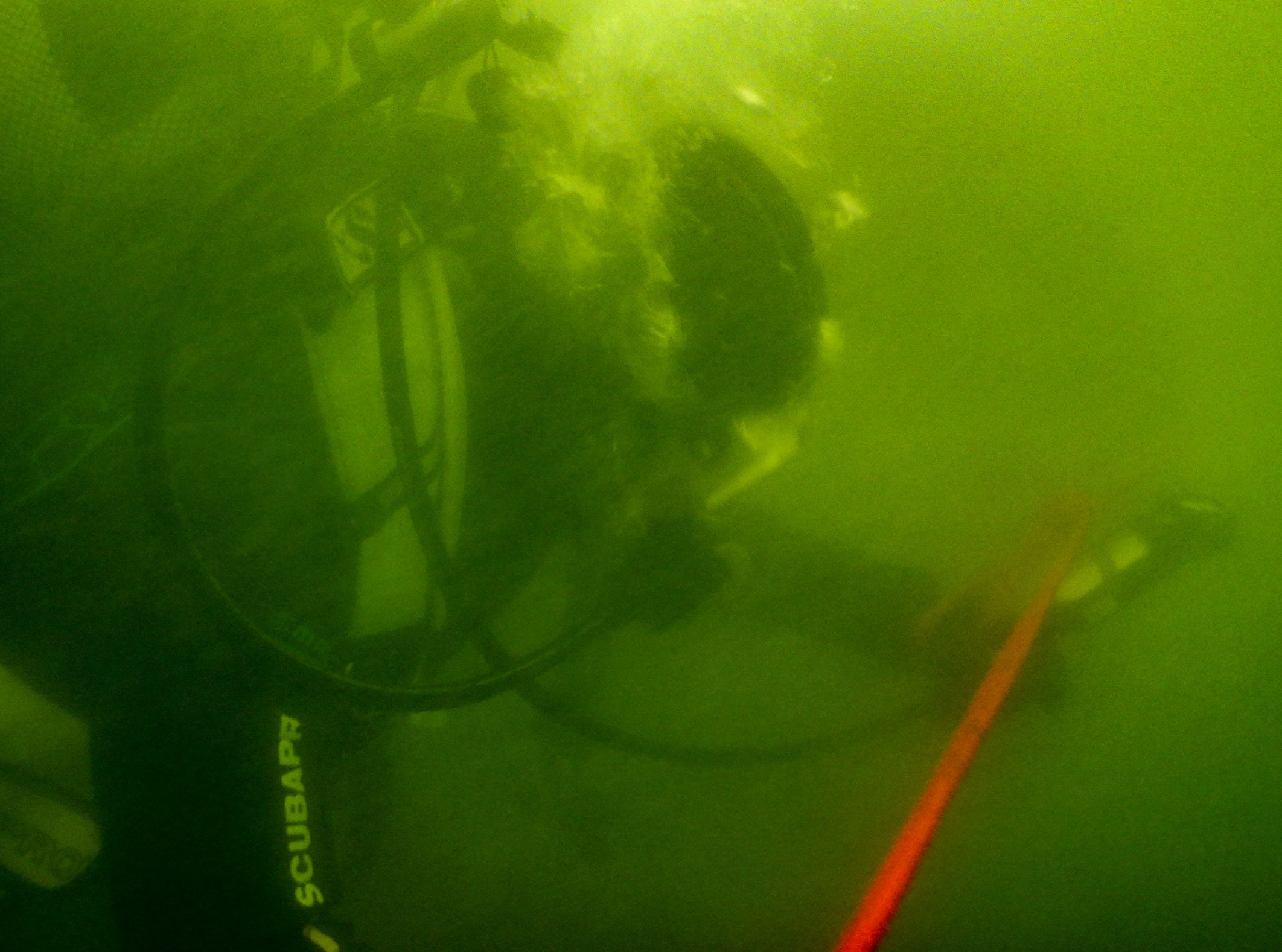 Wie tief es genau ist, kann ich in dem Moment nicht feststellen, weil ich meinen Tauchcomputer nicht ablesen kann. Denn: Die Sicht ist gleich Null. Nur braune Brühe um mich herum.