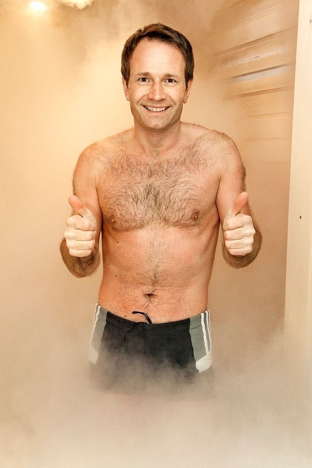 Doch der Purkersdorfer gab nicht auf und stieg in die Kältekammer des Kurzentrums Bad Vöslau. Die „Cryo-Therapie“, eine Kälteschock-Therapie, versprach die Schmerzen in den Beinen „einzufrieren“ und die Entzündungen zu lindern. Nur mit einer Flasche Kräuterlikör zur Stärkung und in Badekleidung stieg der Moderator in die eisige Kammer. „Es war unglaublich. Ich hatte Angst, mein Atem würde zu Eis gefrieren, doch nichts geschah. Stattdessen fiel jedes Mal Schnee, wenn ich die Arme hob! Die Feuchtigkeit, die meine Haut umgab, gefror innerhalb weniger Sekunden.“
