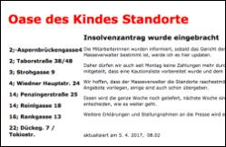Wie der Verein auf seiner Homepage bekannt gibt, wurden die Mitarbeiter über den Konkurs informiert. Allen Eltern, die auf Kautionen warten, wird zudem mitgeteilt, dass eine Kautionsliste vorbereitet wurde, die dem Masseverwalter übergeben wird. Das Essen soll diese Woche noch ausgeliefert werden. Nach den Osterferien wird dann der Masseverwalter entscheiden, wie es mit den Kindergärten weitergeht.