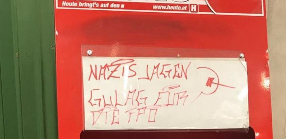 "Nazis jagen. Gulag für die FPÖ" wurde mit roter Schrift auf eine "Heute"-Zeitungsbox in der U-Bahnstation Gumpendorfer Straße geschmiert.