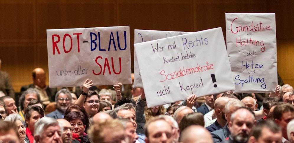 Aus den Slogans "Rot-Blau unter aller Sau", "Wer mit Rechts koaliert, hat die Sozialdemokratie nicht verstanden" und "Grundsätze und Haltung statt Hetze und Spaltung" war die ablehenende Haltung zur Regierungskonstellation im Burgenland abzulesen.