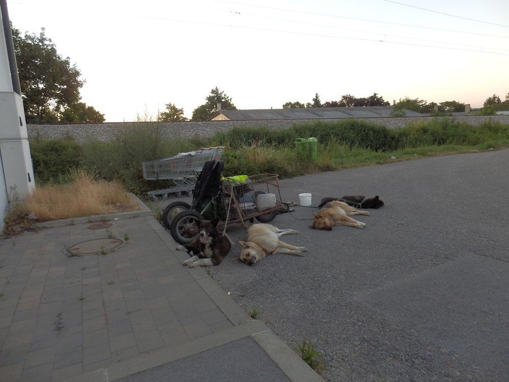 Der Mann baute ein Einkaufswagerl zu einer Art Schlitten um – und lässt sich damit von sechs Vierbeinern durch die Stadt ziehen. Lena F. berichtet "Heute" schockiert: "Der Nomade lässt sich von seiner Baracke hinter einem Supermarkt auf die Tankstelle ziehen. Dort schnorrt er dann Passanten um Bier an." Sechs völlig erschöpfte Hunde (zwei sind sogar trächtig!) müssen in der Zwischenzeit angeleint in einer Bushaltestelle warten.