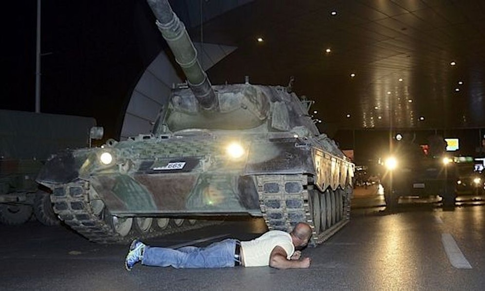 Szenen, die an den Platz des Himmlischen Friedens erinnern: Zivilisten stellen sich den Panzern der Putschisten in den Weg. Dass der Coup des Militärs in der Türkei fehlgeschlagen ist, liege auch an der Zivilbevölkerung, so Ministerpräsident Binali Yildirim. Er sprach in der Nacht auf Samstag von einem "Triumph des Volkes".