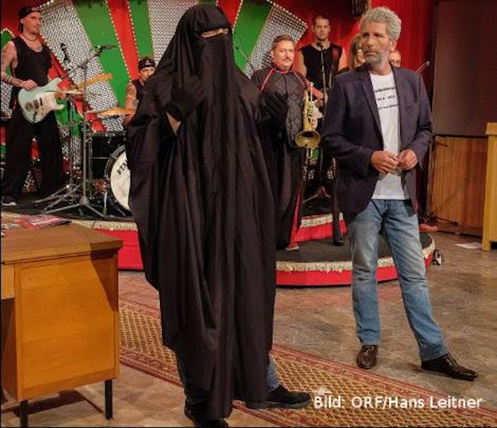 -Studio in einer Burka. Nachdem es ihm zu heiß geworden ist, entledigte er sich dieser jedoch ein paar Minuten später schon wieder.