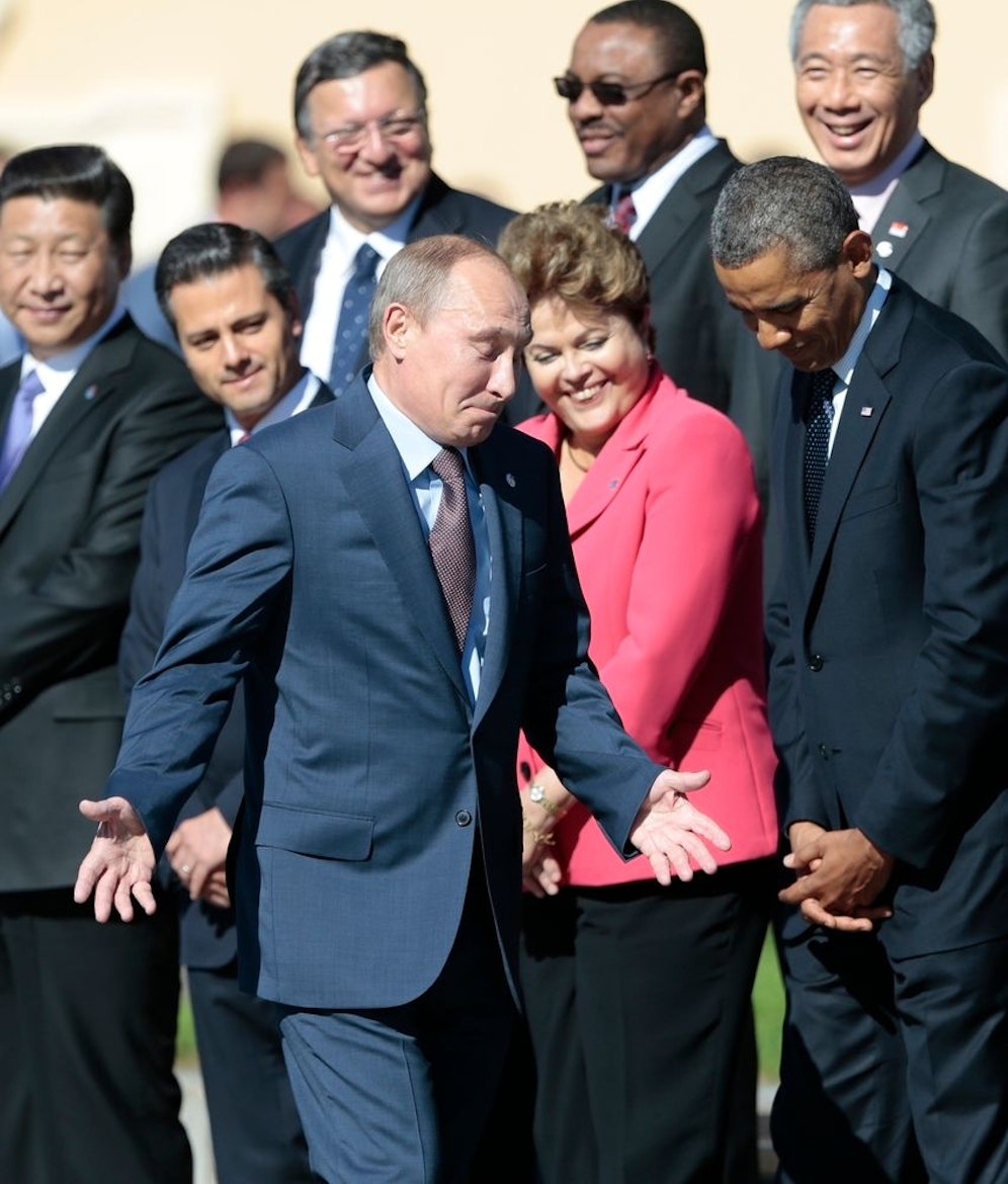 "Here he comes" ("Hier kommt er") - sagte Obama, als der Gastgeber in St. Petersburg als letzter zu den Staats- und Regierungschefs der 20 führenden Wirtschaftsnationen trat. Als Putin an seinem Kollegen in der ersten Reihe vorbeiging, schaute der US-Präsident zu Boden. Und auch Putin suchte keinen Augenkontakt.