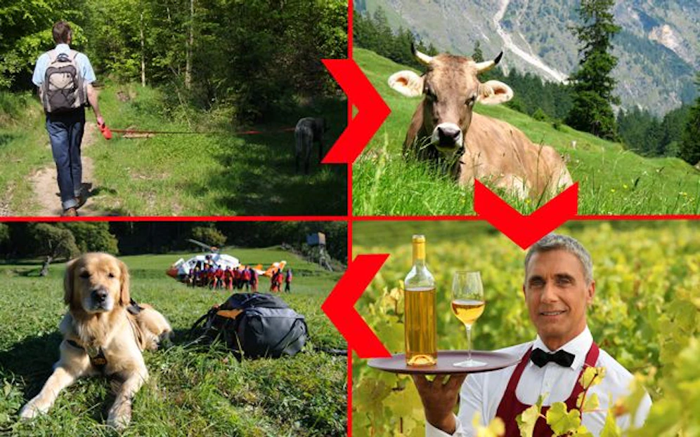 Ein deutscher Wanderer ging mit seinem Hund über die Alm, als eine Kuh ihn angriff. Als ihm ein Kellner zu Hilfe eilte, wurde dieser vom Hund angefallen. Das Match Tiere gegen Menschen ging in Tirol 2:0 für die Tiere aus. Die verletzten Männer wurden ins Spital gebracht.