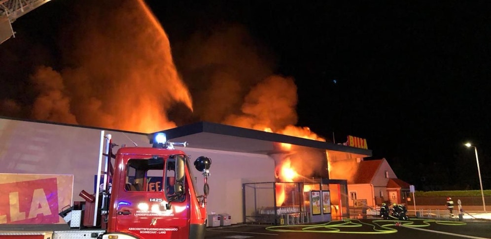 Acht Feuerwehren mit 26 Fahrzeugen und 132 Mann und rückten zum Löscheinsatz aus. Der Supermarkt sei fast völlig ausgebrannt, berichtete die FF Himberg.