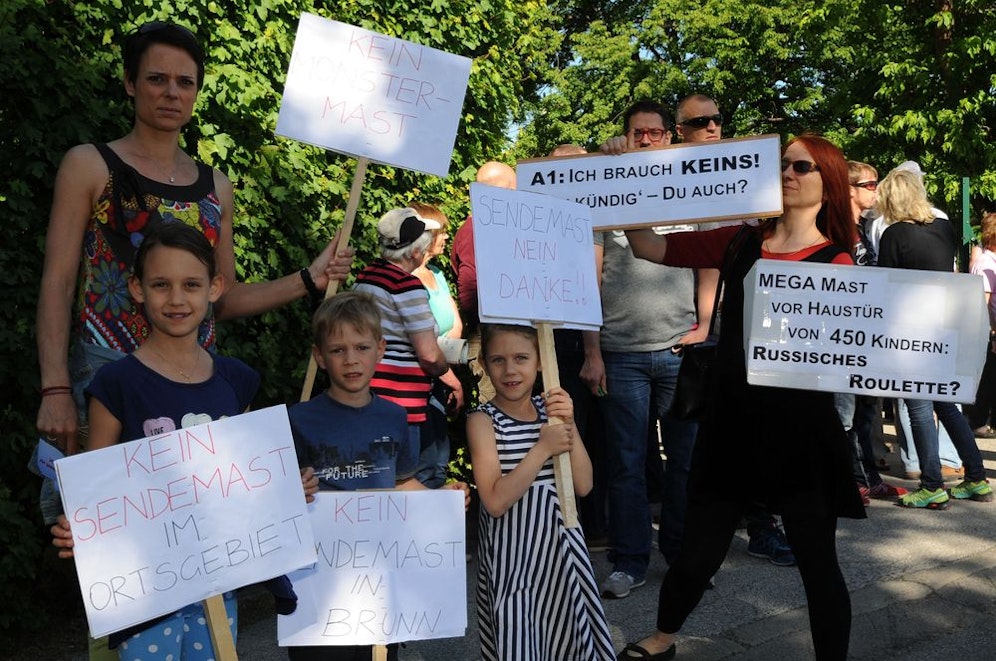 Die Spielplätze in der Heugasse in Brunn/Gebirge (Mödling) waren am Montag Treffpunkt für rund 180 besorgte Anrainer aus Maria Enzersdorf – sie demonstrierten gegen den geplanten 30 Meter hohen A1-Handymast.