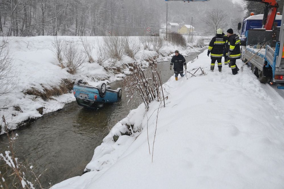Ein Lenker kam von der schneeglatten Fahrbahn ab, stürzte über eine Böschung und krachte gegen einen Zaun. Verletzt wurde niemand. Die freiwillige Feuerwehr Berndorf musste das Auto per Seilwinde aus dem Graben ziehen.