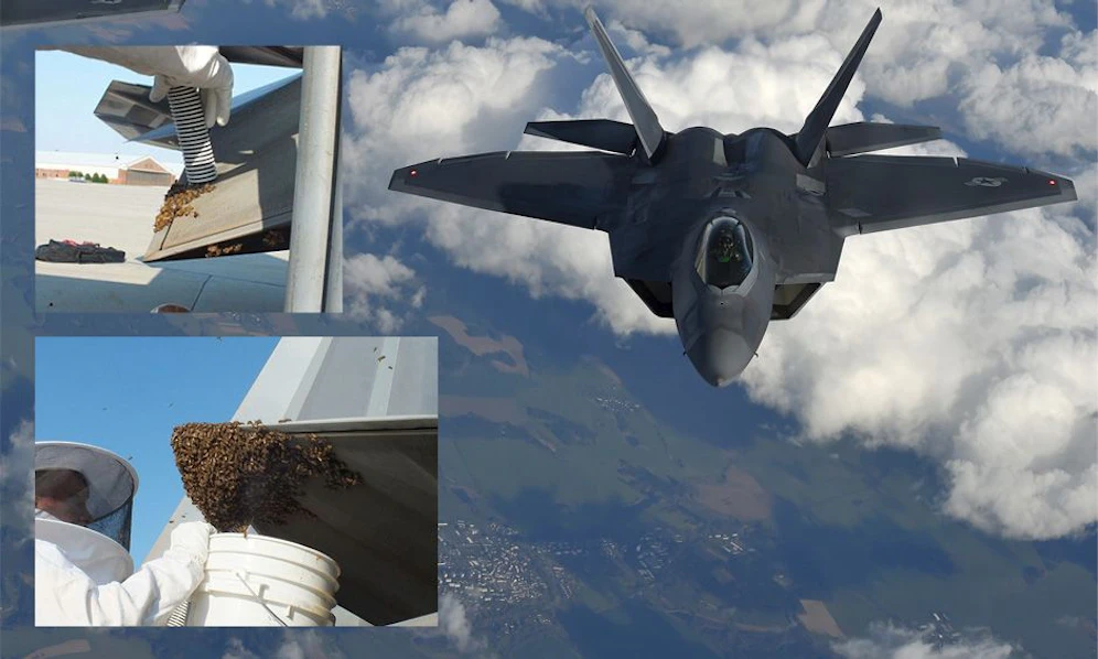 20.000 Davids gegen einen Goliath? Ein gigantischer Kampfjet wurde von kleinen Tieren in die Knie gezwungen - zumindest zeitweise: Ein F-22 Jet der US-Streitkräfte wurde zum Heim für einen Schwarm von knapp 20.000 Bienen. Die Tiere hatten sich im Triebwerksbereich eingenistet und wurden bei Wartungsarbeiten im Bundesstaat Virginia entdeckt.