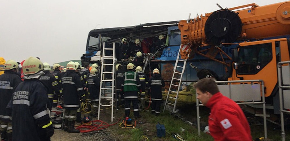 Die Feuerwehren aus Großpetersdorf, Oberwart und Jabing, Rettungskräfte sowie die Polizei sind vor Ort im Einsatz. Erste Bilder vom Unfallort zeigen, dass die linke Seite des Busses vom Kran regelrecht aufgerissen wurde.