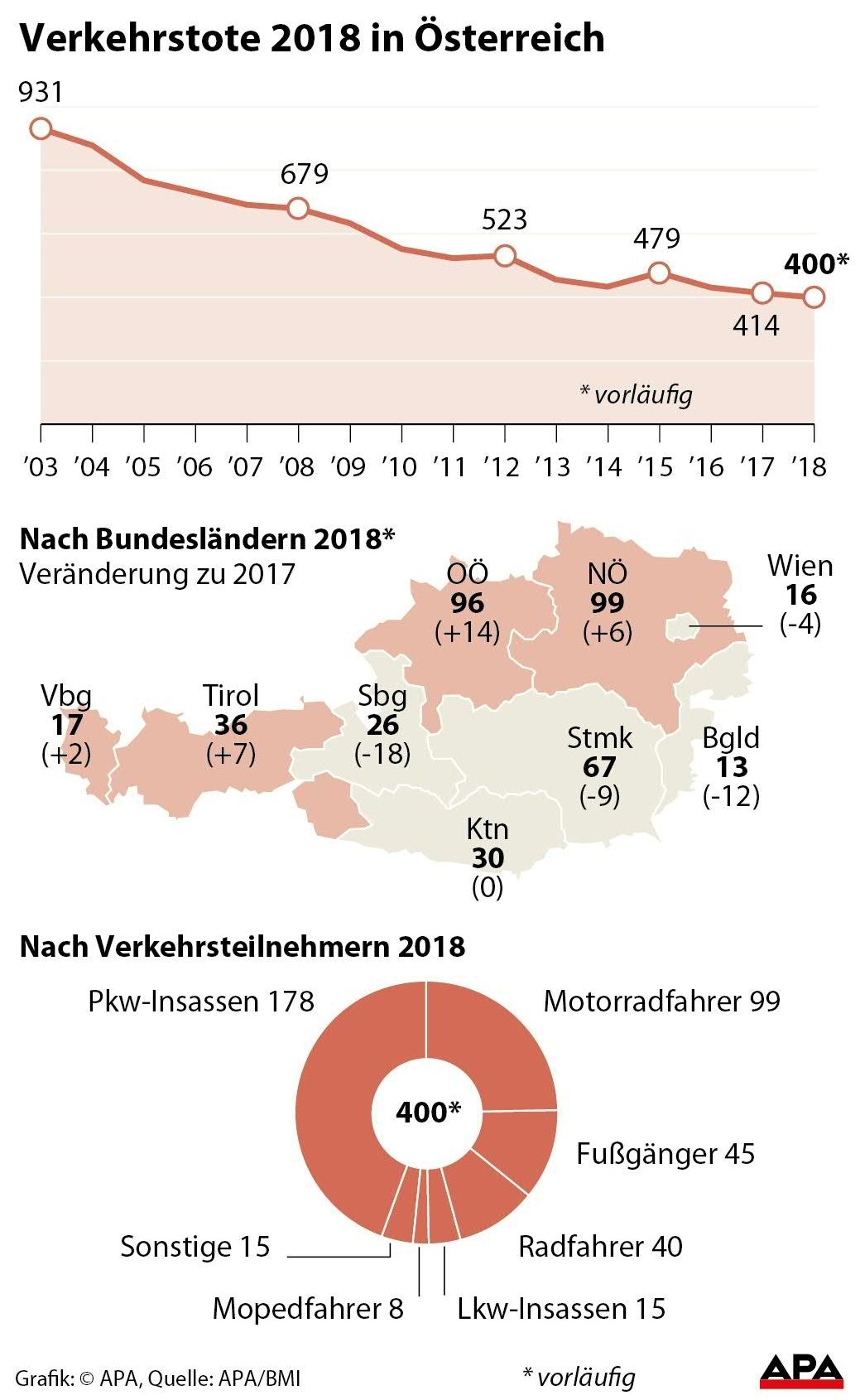 Mit genau 400 Verkehrstoten starben im Jahr 2018 so wenig Menschen wie noch nie auf Österreichs Straßen. Es ist die niedrigste Zahl seit Beginn der Aufzeichnungen im Jahr 1950 und um 3,4 Prozent (14 Personen) weniger als 2017.