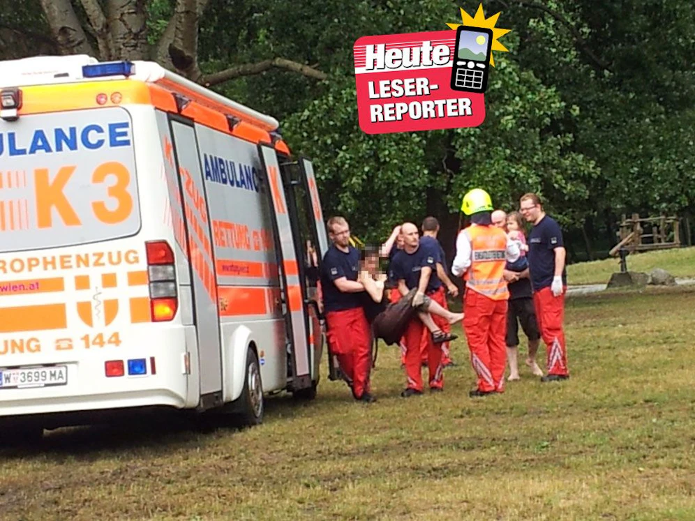 Um 17.21 Uhr schlug der Blitz in einen Baum auf der Jesuitenwiese ein. Darunter hatten Menschen vom danebenliegenden Spielpaltz Schutz gesucht. Eine 44-jährige Frau wurde dabei indirekt erfasst. Sie erlitt dadurch Herzrhythmusstörungen und musste von der Wiener Rettung vor Ort versorgt werden. Die Sanitäter stabilisierten die Verletzte und lieferten sie und weitere neuen Erwachsene und sechs Kinder ins Krankenhaus ein.