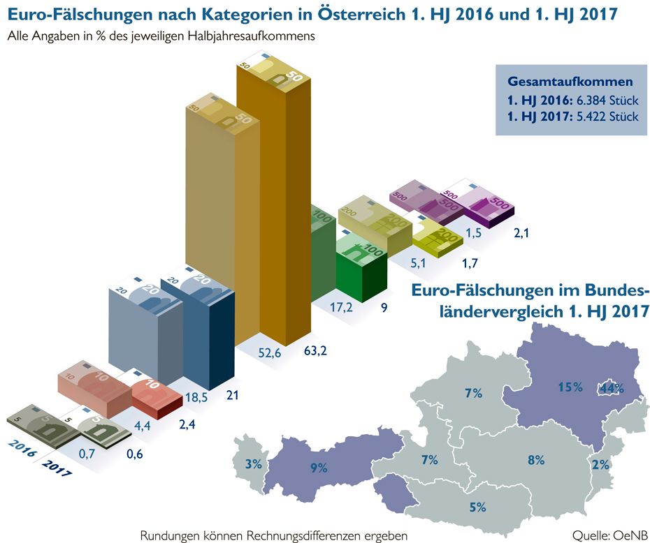 Diese Scheine, die sich tatsächlich im Umlauf befanden und nicht etwa bei Polizeiaktionen sichergestellt wurden, hatten einen Nennwert von 320.115 Euro. Im 1. Halbjahr 2016 hatte der Schaden noch 417.690 Euro betragen. Das bedeutet einen Rückgang um etwas mehr als 23 Prozent.