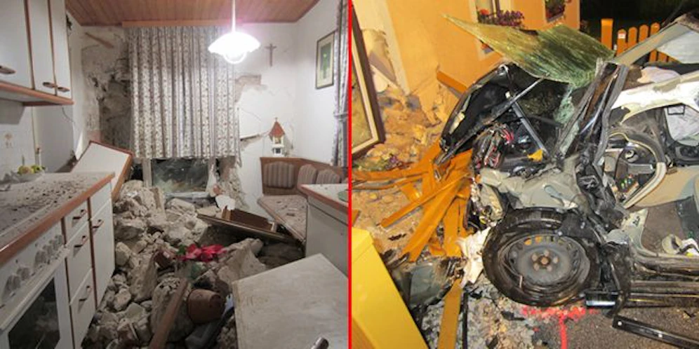 Durch die Wucht des Aufpralls wurden auch die Hauswand in Mitleidenschaft gezogen und Teile der dahinter befindlichen Einrichtung zerstört. Die 75-jährige Hausbewohnerin blieb unverletzt, die Schadenssumme konnte noch nicht beziffert werden.