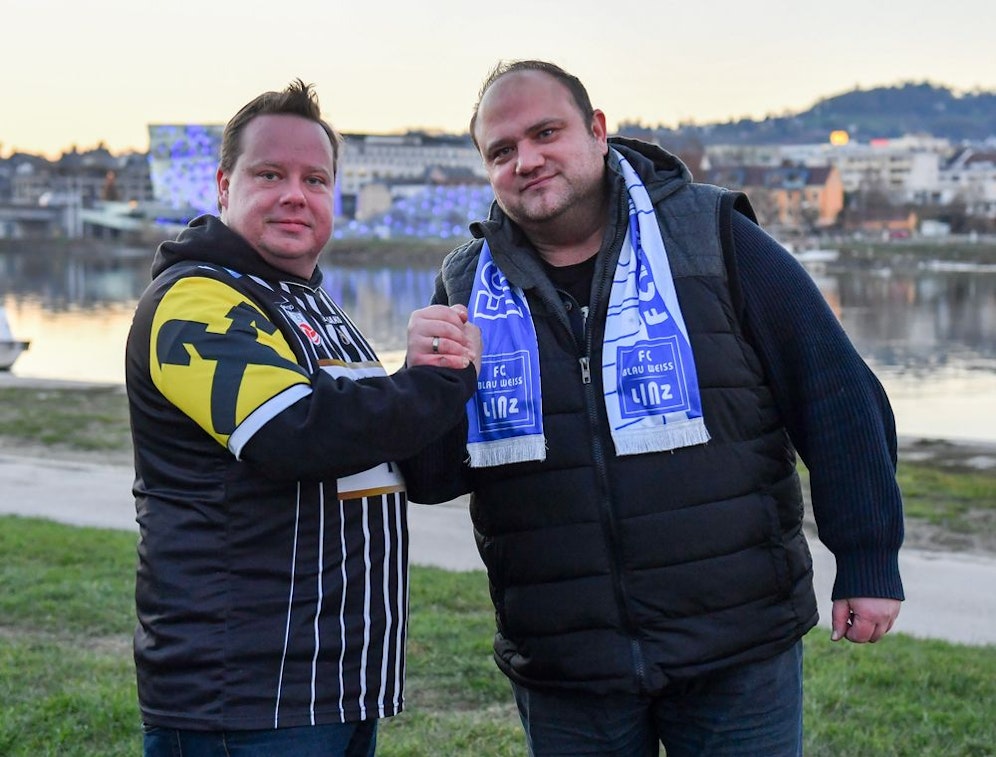Oliver Schoppers (36) Herz schlägt für Blau Weiß. Sein Kumpel Jürgen Schmid (33) drückt dem LASK die Daumen. Seit Jahren sind sie gute Freunde, doch beim Derby herrscht morgen Funkstille.