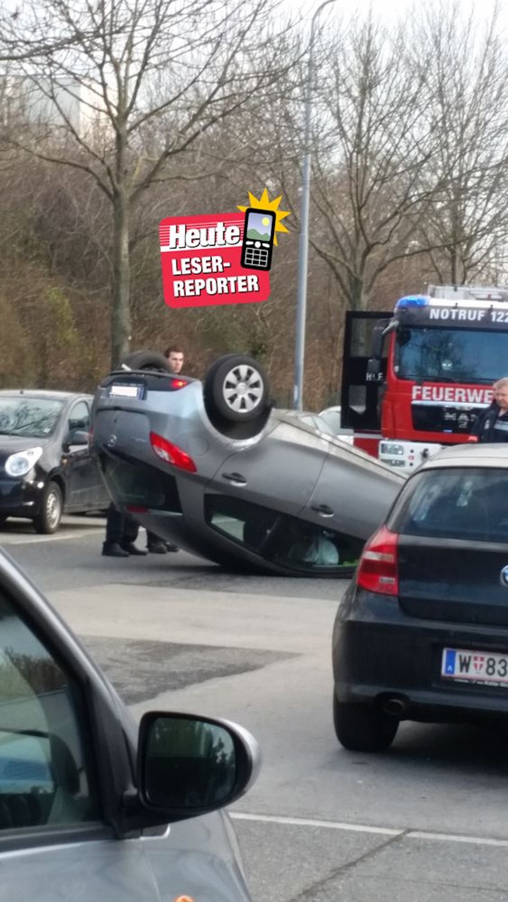 Zu einem spektakulären Unfall kam es Mittwochnachmittag auf der Wulzendorfstaße in Donaustadt. Eine 38-Jährige stieß mit einem Pkw zusammen und wurde durch die Wucht in Luft geschleudert. Ihr Auto blieb auf dem Dach liegen.
