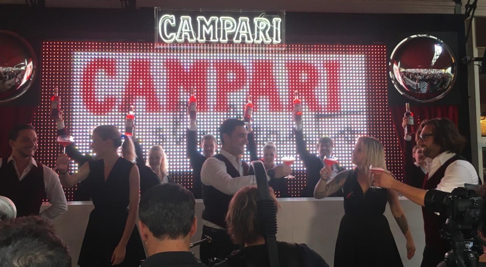 Kurz nach 19 Uhr shakten sich Wiens bekannte Barkeeper gemeinsam mit Stepptänzern zu dem Italo-Hit "We No Speak Americano" auf die Bühne vor dem Schwarzen Kameel. Erst dort trat auch Mattia Pastori, Head Bartender aus dem „Camparino in der Galleria in Mailand", in das Licht der untergehenden Sonne, um den perfekten Campari Shakerato zuzubereiten.