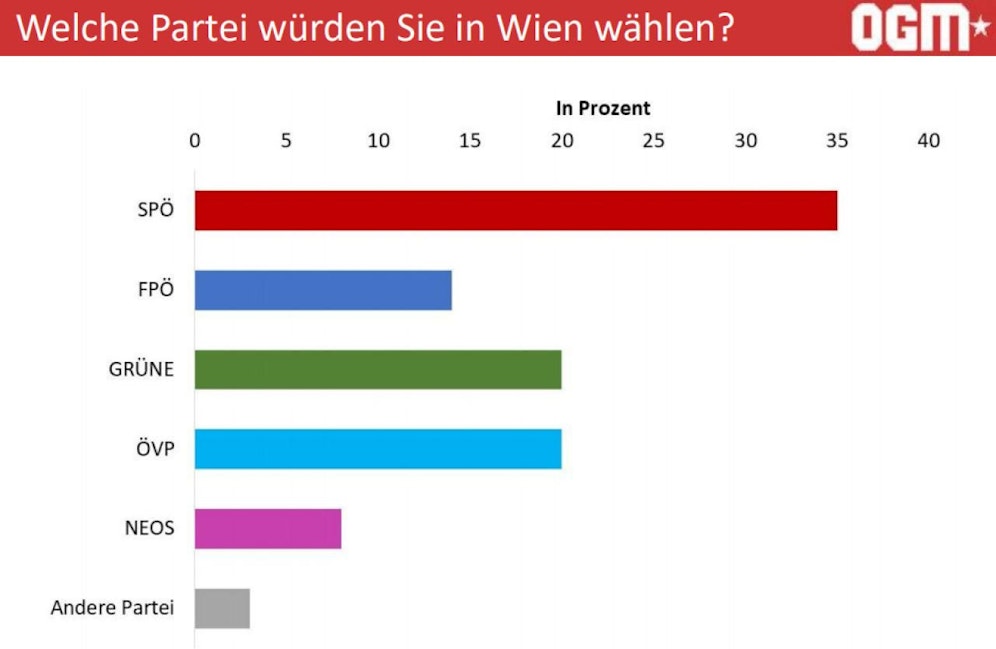 2015 wählten rund 40 Prozent der Wiener die SPÖ. Im Vergleich zu 2015 verliert sie nun leicht und kommt auf 35 Prozent. Die Grünen legen um acht Prozent zu und kommen auf 20 Prozent. Die ÖVP würde ihre Stimmen verdoppeln und kommt ebenfalls auf 20 Prozent. Die Neos legen um zwei Prozent zu und kommen auf acht Prozent.