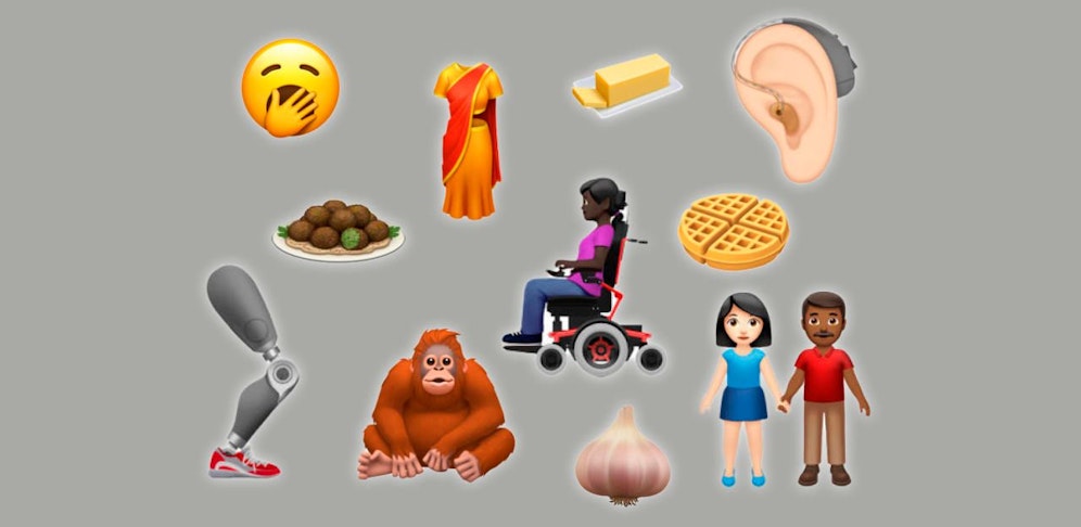 Nach Apples Vorschlag an das Unicode-Konsortium, mehr Emojis für Menschen mit körperlichen Einschränkungen einzuführen, wird es auch einen Blindenhund, ein Ohr mit Hörgerät, Rollstühle und eine Arm- sowie eine Beinprothese in der Emoji-Tastatur geben. Außerdem neu dabei: Ein gähnender Smiley, ein einteiliger Badeanzug, Waffeln, Falafel, Butter und Knoblauch sowie Faultier, Flamingo, Orang-Utan und Stinktier.