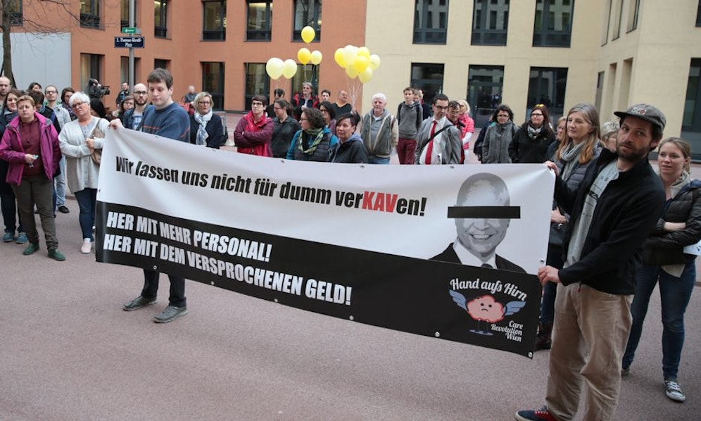 Unter dem Motto "Weitermachen" versammelten sich am Dienstag rund 80 Pflegekräfte vor der KAV-Generaldirektion in Landstraße.