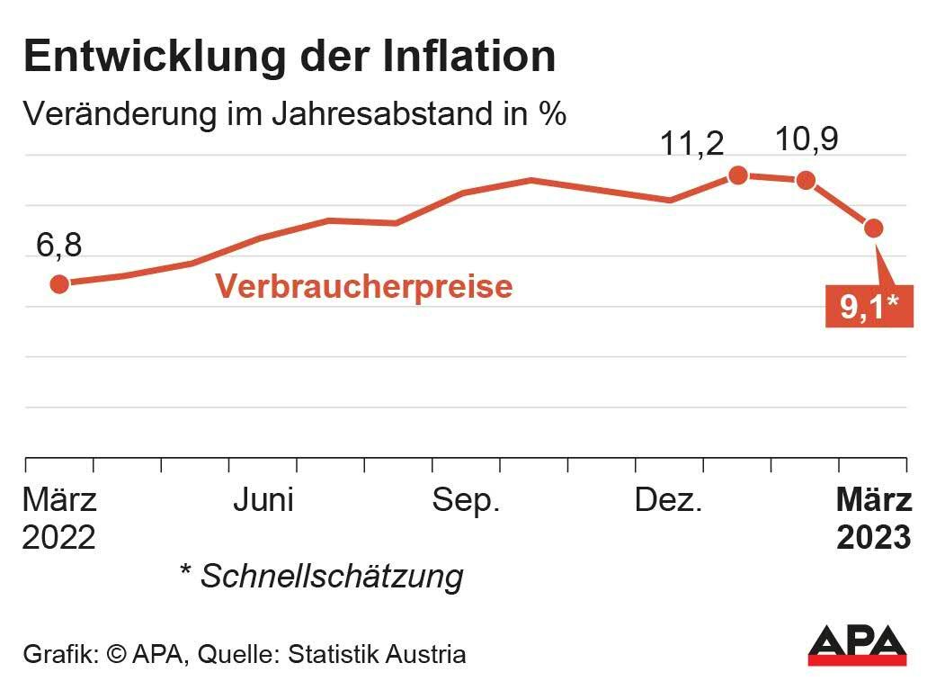 Die Inflationsrate für März 2023 beträgt voraussichtlich 9,1 Prozent, wie aus Berechnungen von Statistik Austria im Rahmen einer Schnellschätzung hervorgeht. Gegenüber dem Vormonat Februar steigt das Preisniveau voraussichtlich um 0,4 Prozent.