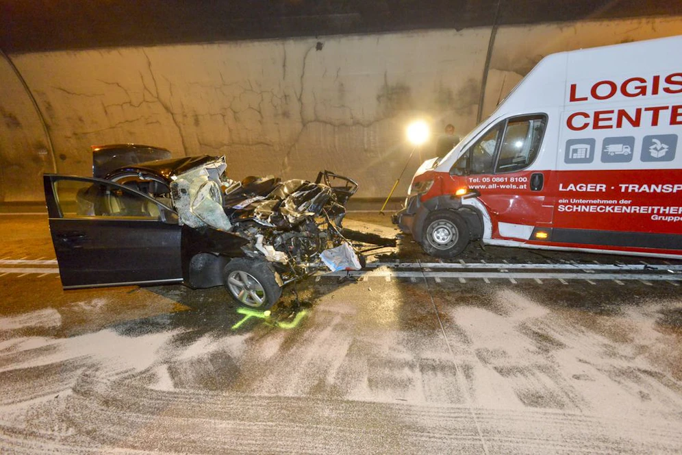Ein schwerer Unfall hat sich am Mittwoch im Spering-Tunnel auf der Pyhrnautobahn ereignet. Ein Pkw krachte frontal gegen einen Lkw und wurde danach von einem weiteren Laster erfasst. Für den Lenker kam jede Hilfe zu spät.