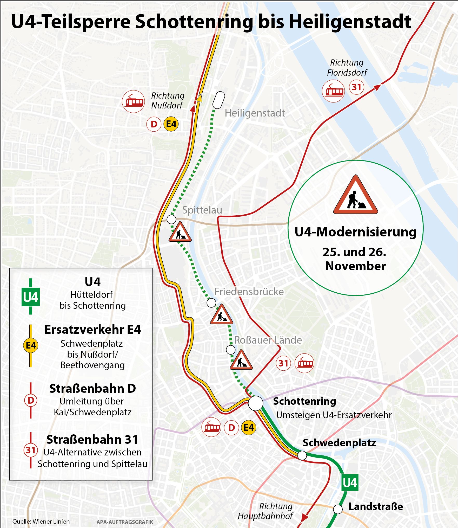 Mit den Linien E4 und D verkehrt dann am Wochenende tagsüber alle 5 Minuten eine Straßenbahn zwischen Schottenring und Nußdorf. Von der vorläufigen U4-Endstation Schottenring können die Fahrgäste direkt in die beiden Ersatzlinien umsteigen. Die Arbeiten starten in der Nacht von Freitag auf Samstag ab etwa 0.30 Uhr. Gleichzeitig nimmt auch die Ersatzlinie E4 ihren Betrieb auf. Nachts ist die Linie E4 wie die Nacht-U-Bahn alle 15 Minuten unterwegs.