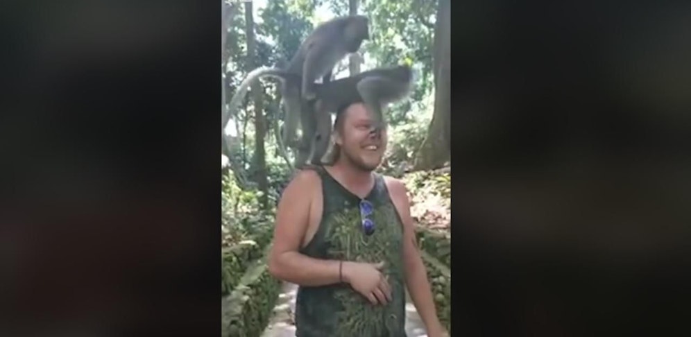 "Hatten die Sex auf mir?", fragt der junge Mann seine Begleitung. Ja, es stimmt: Die Affen hatten gerade Geschlechtsverkehr auf der Schulter dieses Touristen.