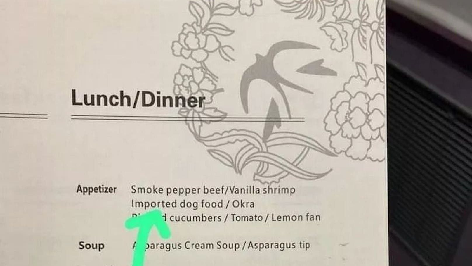 Das Essen in Flugzeugen hat nicht den besten Ruf, das ist bekannt. Aber eine Fluggesellschaft hat es damit wohl etwas zu weit getrieben. Ein Bild der Speisekarte auf einem China Eastern Airlines-Flug sorgt derzeit im Internet für Erheiterung. Ein Passagier teilte ein Bild der Speisekarte der Business Class und machte auf einen Punkt auf der Liste aufmerksam. Als Vorspeise wird unter anderem "importiertes Hundefutter mit Okra" angeboten. Wie bitte?