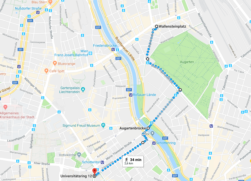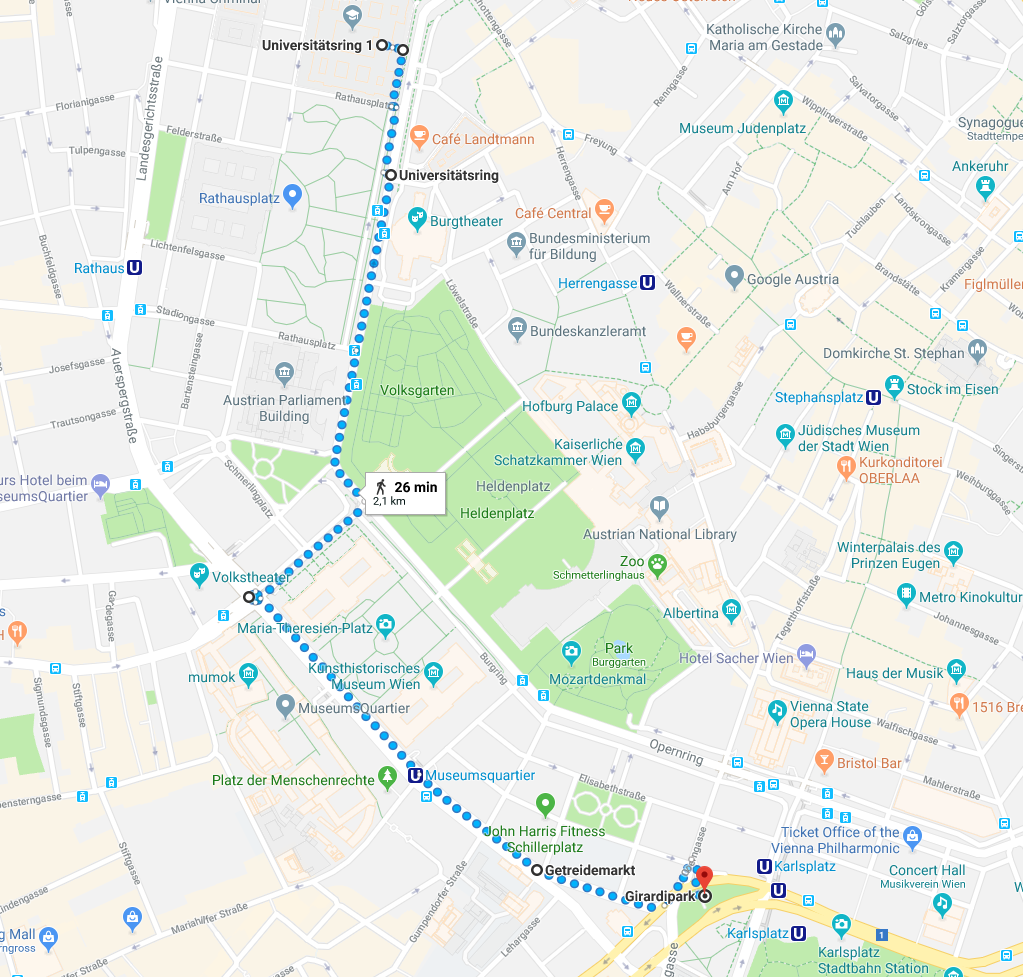 Grafik: Dort treffen die Teilnehmer bei der Uni Wien auf den zweiten Demozug. Ziel ist beim Girardipark (Quelle: Google Maps)